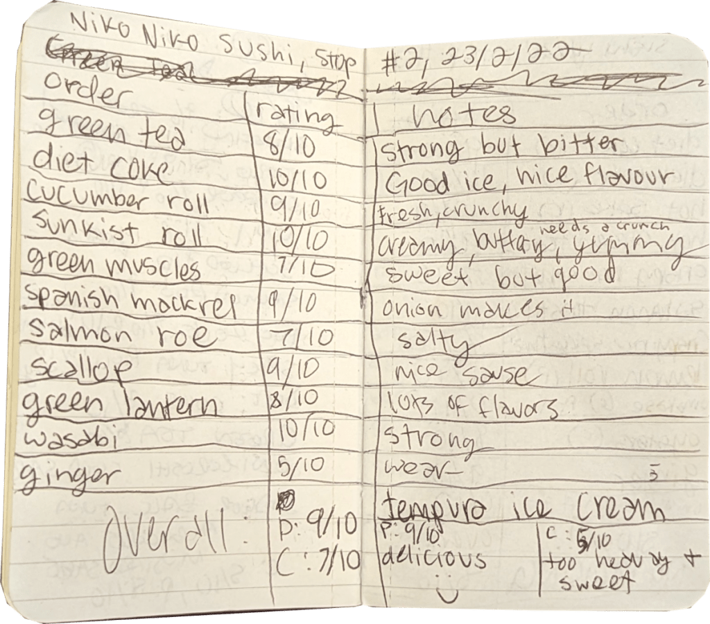 | P | Cucumber roll | 9/10 | Fresh, crunchy |