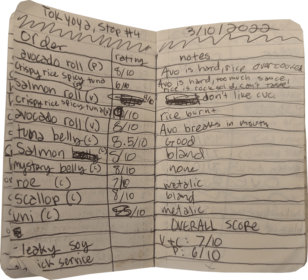 | Salmon roll (Viv) | 9/10 | Didn’t like the cucumber |