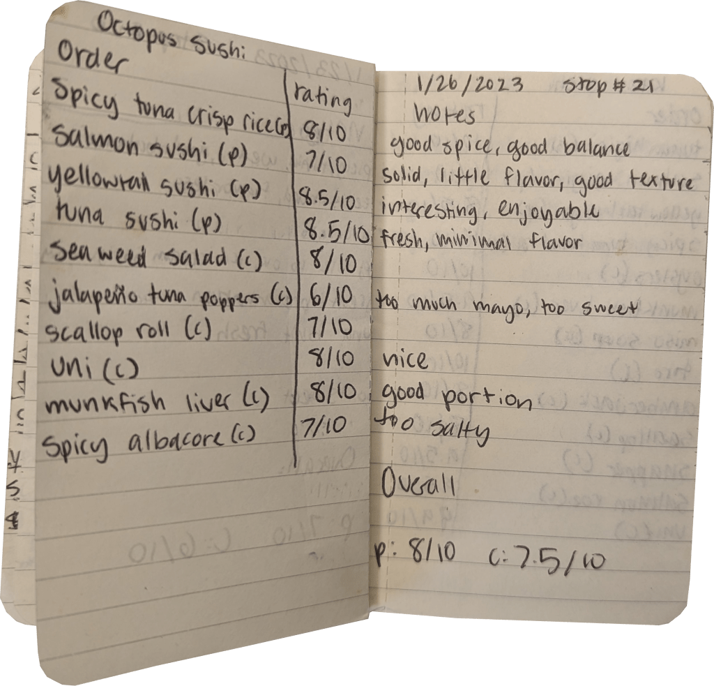 | Yellowtail sushi (Poesy) | 8.5/10 | Interesting, enjoyable |
