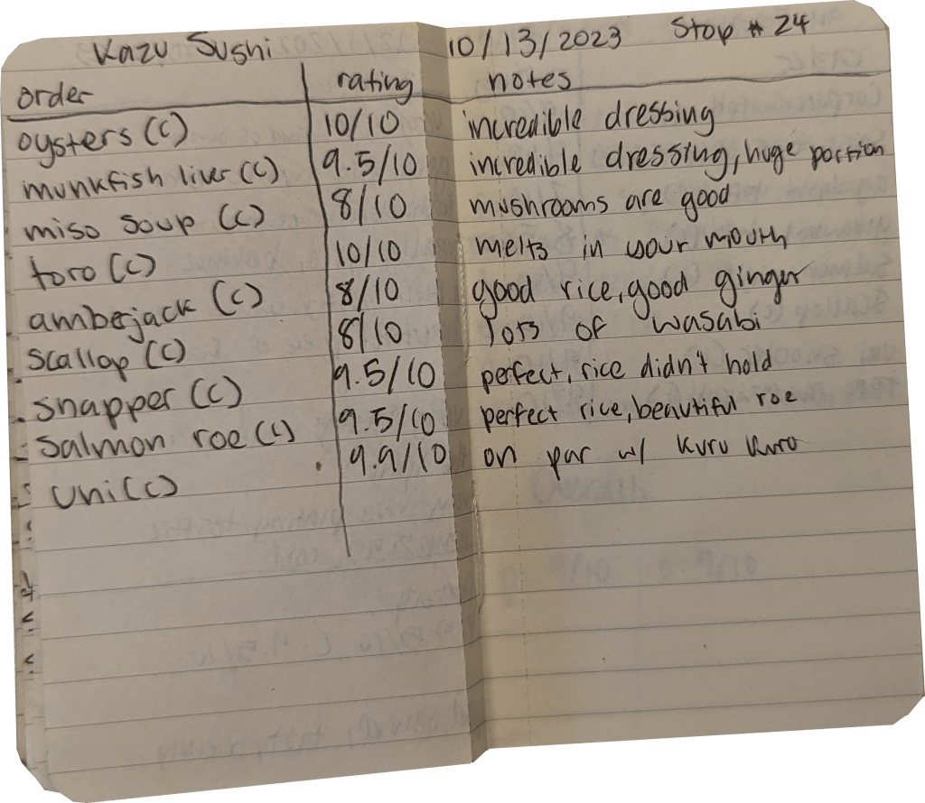 | Amberjack (Cory) | 8/10 | Good rice, good ginger |